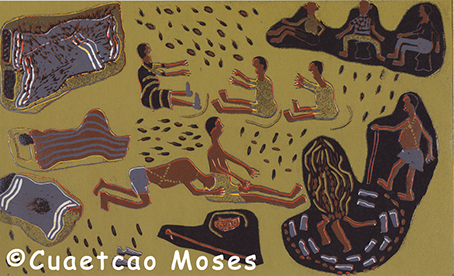 Flodens Moder dansar, men det ser inte ut som hon dansar, det ser ut som om hon är floden. Det ser ut som om hon får floden att röra sig, svälla, minska, alltefter hennes vilja, önskan och rörelser. Efter att ha sett Flodens Moder fånga floderna och släppa dem fria, välta kanoter och hjälpa flodfarare, i vad som känns som en evighet, så tystnar koskällan och de flesta trummorna.