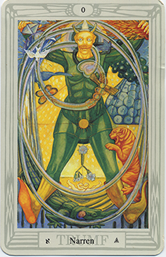 “Det högsta kortet är nollan, Narren, som är både 0 och 22, både det första och det sista kortet. Det är Narren som i sin högre aspekt är det mest utvecklade kortet. Narren, gycklaren, dåren är ord och företeelser som vi uppfattar som naiva och definitivt ser som underordnade vishet. Hur kan det vara det mest utvecklade kortet? Narren driver med oss, narrar oss och lockar oss till skratt. Narren bjuder på sig själv, tar risker med sin egen person för att komma vidare och för att öppna upp för andra att komma vidare. Narren säger sanningar till oss och Narren har en lekfull attityd till livet. Narren är, i sin högre aspekt, Det Gudomliga Spontana Barnet, som vandrar i världen i total samhörighet med världsalltet.”