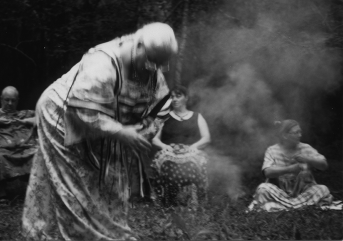 Huset är fullt med människor. Barn kommer inspringande och vill sitta en stund hos farmor, en kvinna matar sin baby, i köket som är öppet mot rummet håller några på att förbereda lunch. Den vita vargen, Tsauna, ligger just nu vid husses fötter. Människor sitter på stolar och soffor, på golvet och på kuddar. På altaret brinner den ceremoniella, heliga elden i form av ett ljus. Mitt i rummet, cirkeln, är scenen där psykodramat pågår.