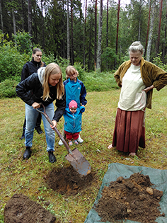 Eftersom ritualplatsen ligger några kilometer bort fäste vi björken på mitt takräcke och gav oss av. Väl framme vid ritualplatsen skapade vi cirkeln genom att kalla in krafterna och laddar den med galdrar. Sen grävde vi en hålgrop, offrade örter och smyckade med blommor, blåbär och annat som växte i närheten.